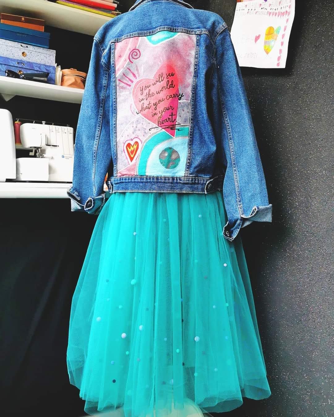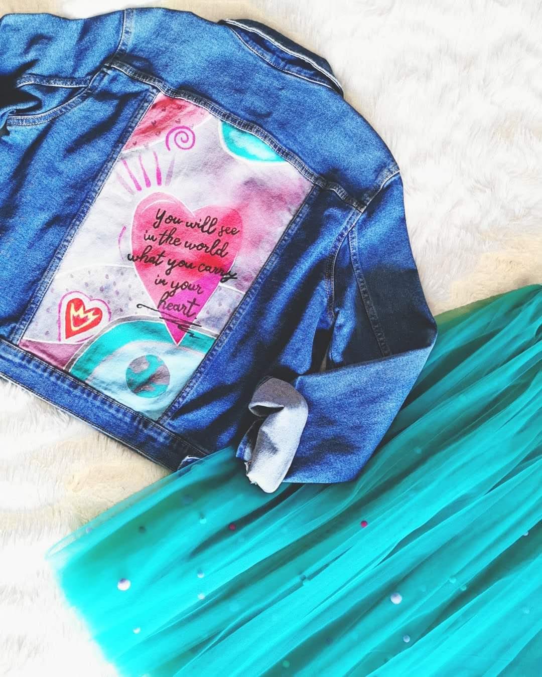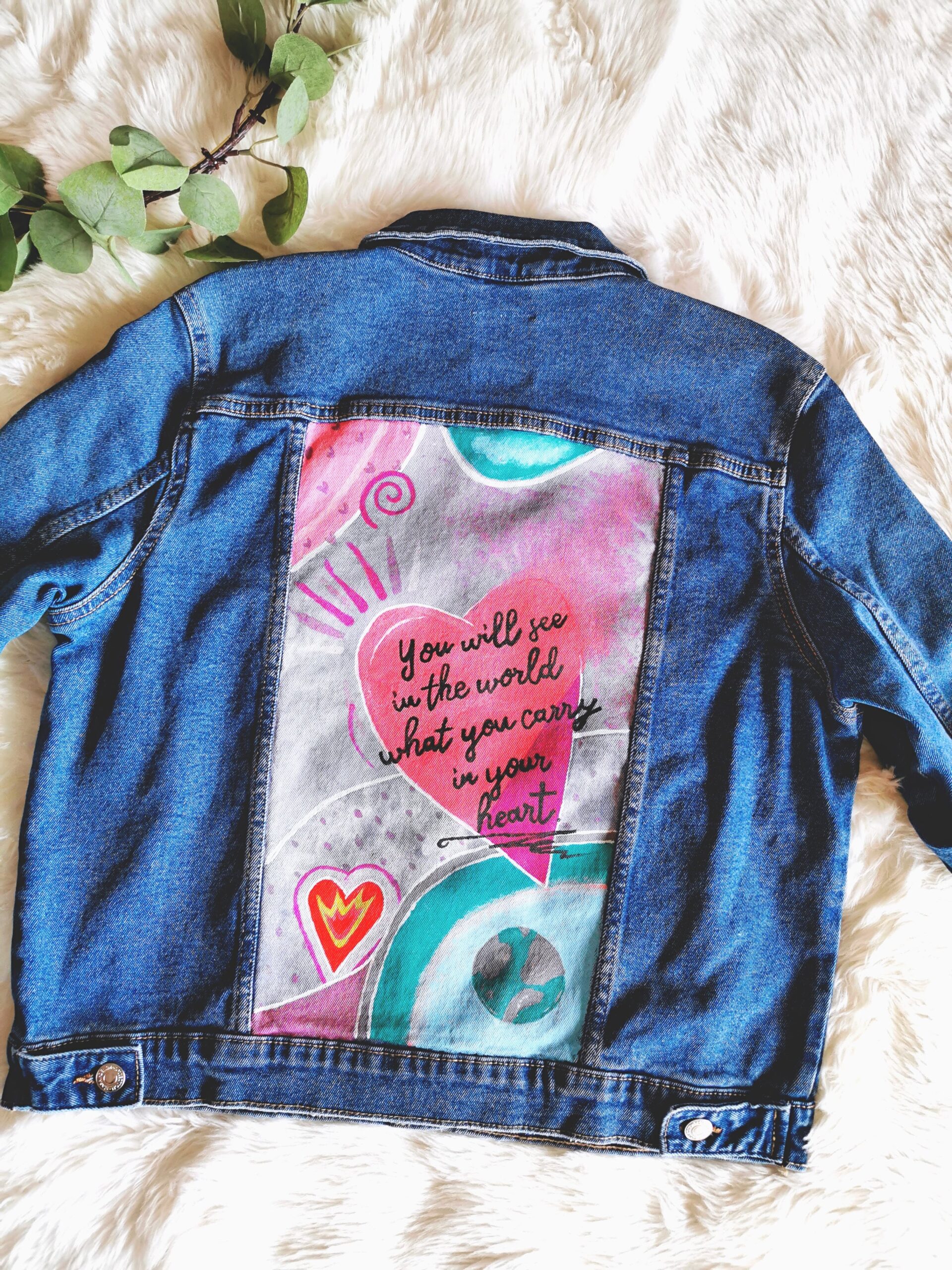 Nimic nu intregeste mai frumos o tinuta ca o geaca din denim, cu atat mai mult cu cat e personalizata dupa propria personalitate. In aceasta geaca am cuprins iubirea de sine si fata de ceilalti printr-un mesaj sublim: ” You will see in the world what you carry in your heart”. Geaca este pictata manual, rezistenta la spalat si gata sa coloreze suflete oriunde ajunge.