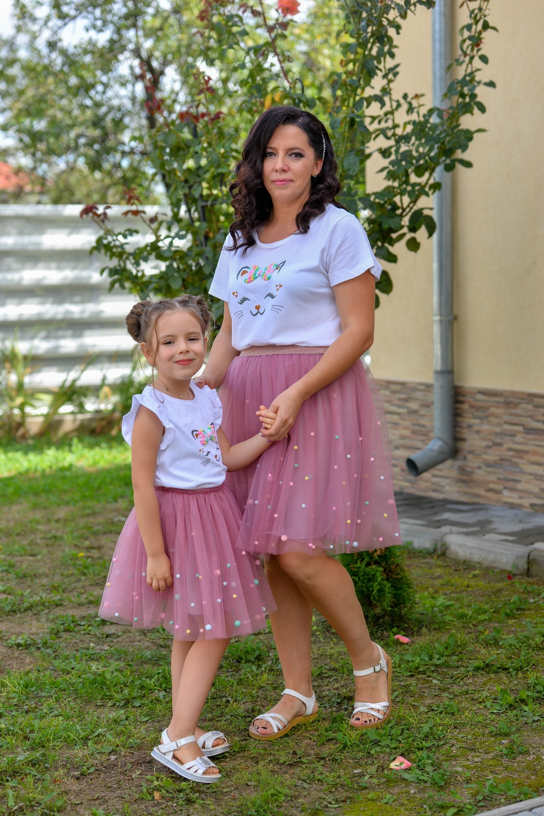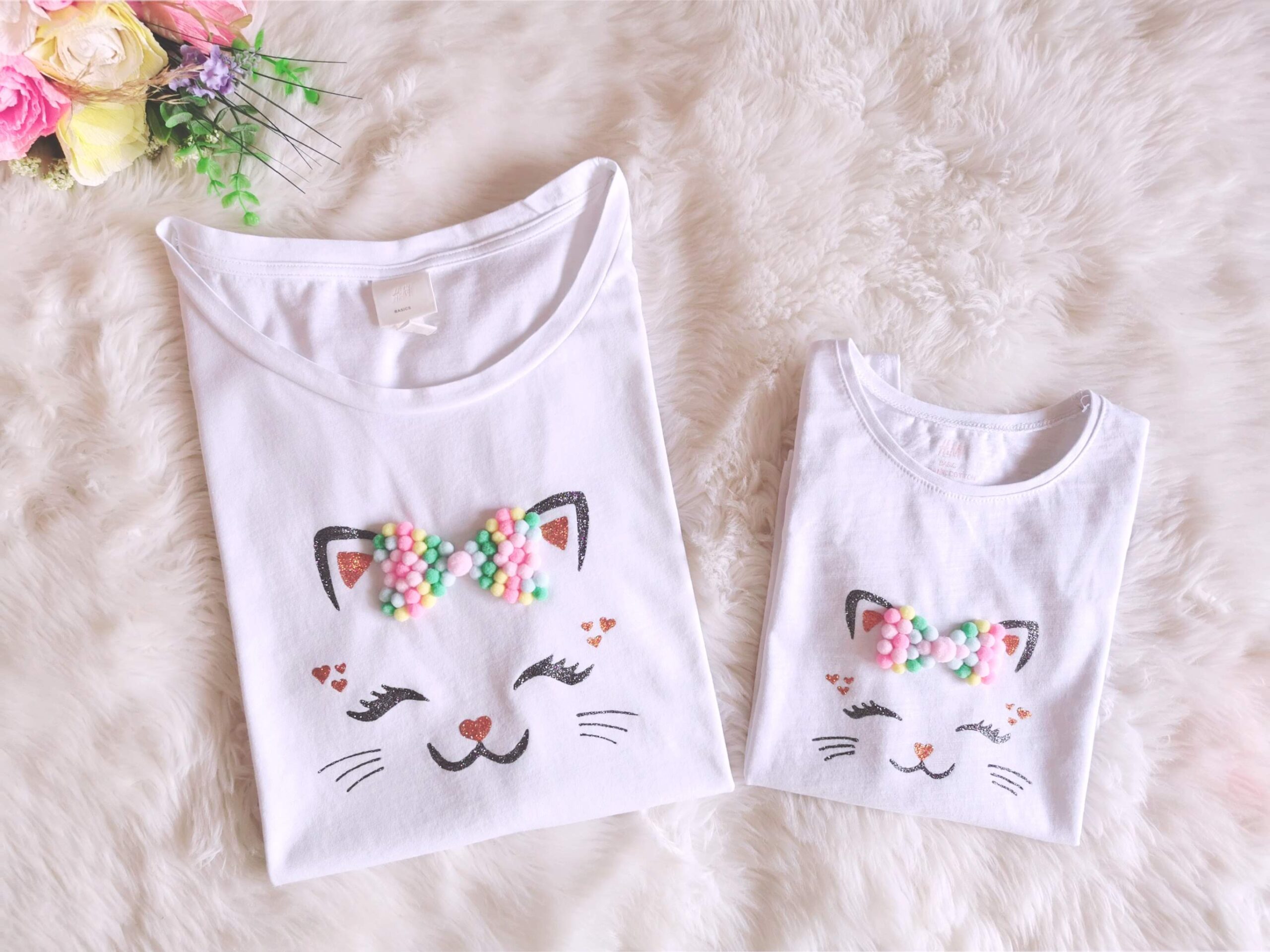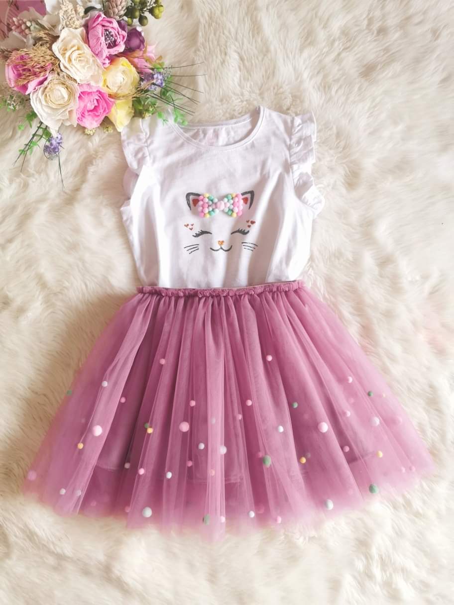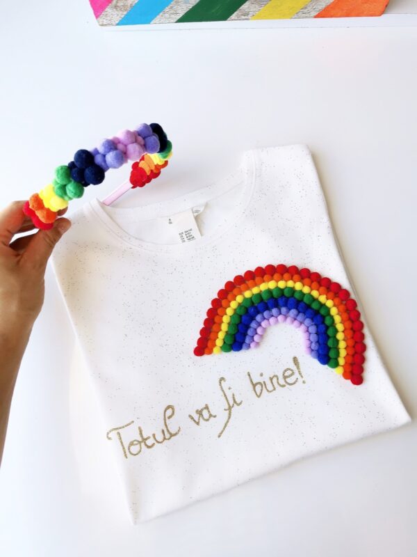 Tricou pictat manual si accesorizat cu pompoane in nuante pastelate.